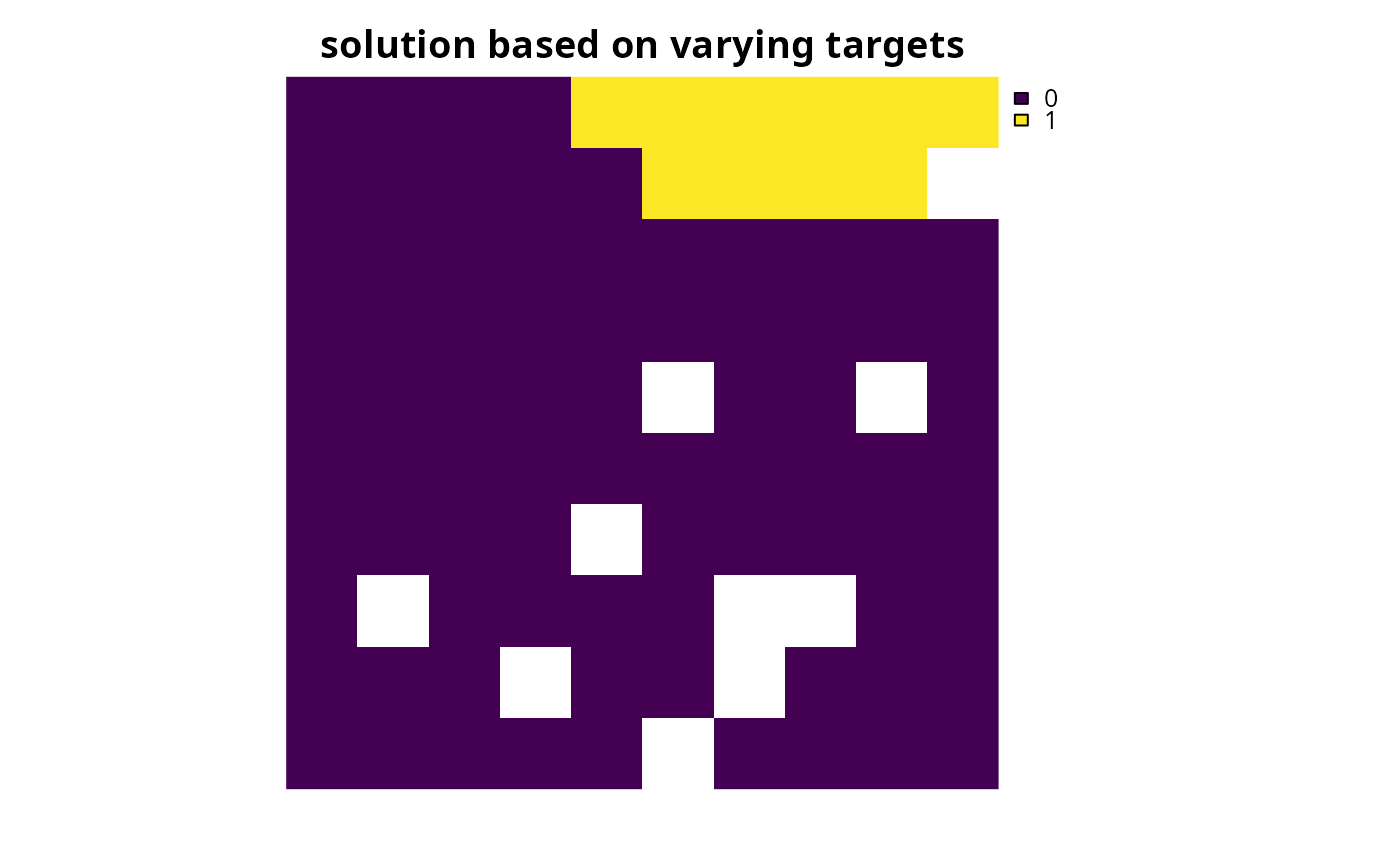 plot(s2, main = "solution based on varying targets", axes = FALSE)