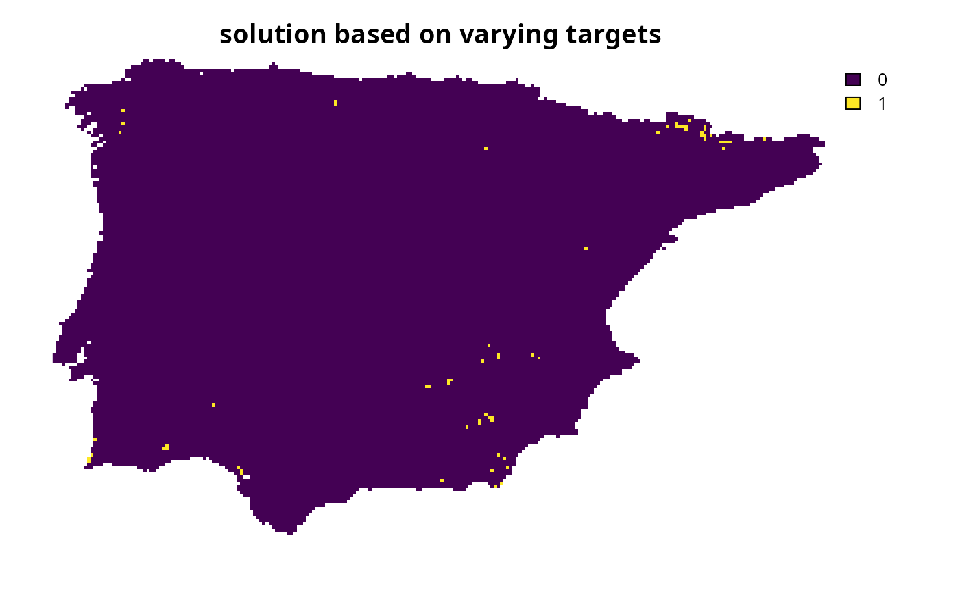 plot(s2, main = "solution based on varying targets", axes = FALSE)